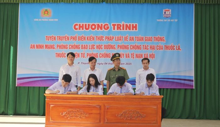 Học sinh trường THPT Hà Huy Tập, phường Thành Vinh (Nghệ An) ký cam kết nghiêm túc thực hiện Luật Trật tự an toàn giao thông đường bộ.