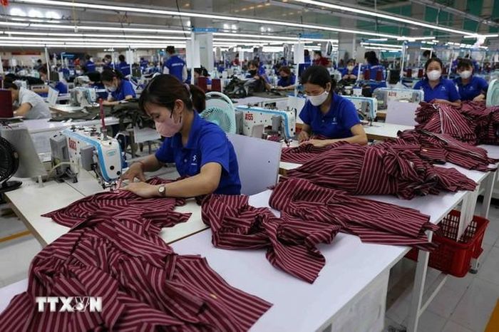 May hàng xuất khẩu sang thị trường châu Âu tại Khu công nghiệp VSIP Nghệ An. (Ảnh: Vũ Sinh/TTXVN)
